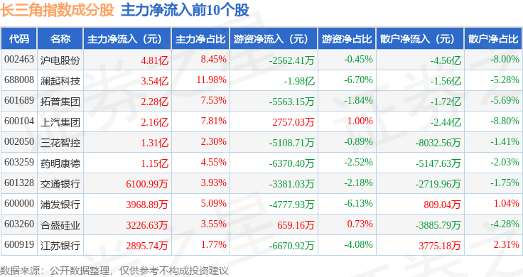 资金流向方面,长三角(399355)指数成份股当日主力资金净流出合计1.46亿元,游资资金净流出合计2.58亿元,散户资金净流入合计4.04亿元。成份股资金流向详情见下表: