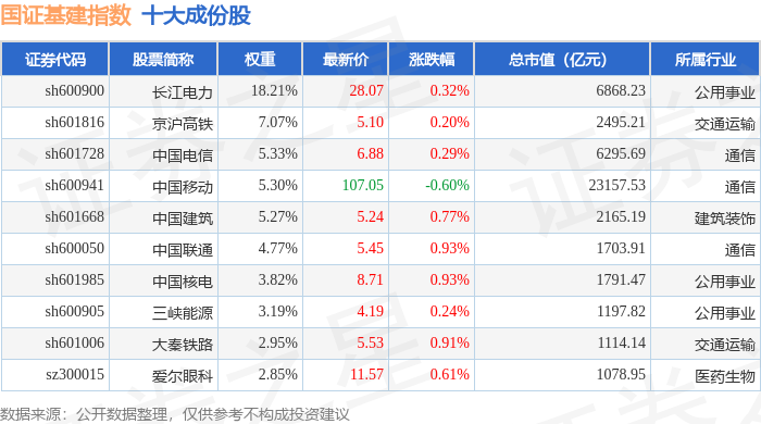 证券之星消息,12月1日,国证基建(399359)指数报收于2683.75点,涨0.45%,成交217.82亿元,换手率0.45%。当日该指数成份股中,上涨的有42家,新奥股份以3.15%的涨幅领涨,下跌的有8家,申能股份以4.05%的跌幅领跌。