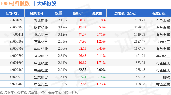 1000材料(399382)指数十大成份股详情如下: