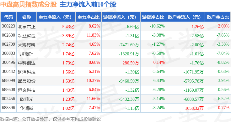 资金流向方面,中盘高贝(399407)指数成份股当日主力资金净流出合计4.84亿元,游资资金净流入合计2.59亿元,散户资金净流入合计2.24亿元。成份股资金流向详情见下表: