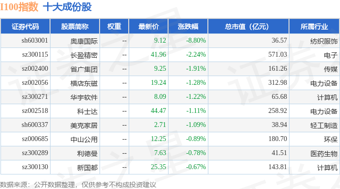 证券之星消息,12月1日,I100(399415)指数报收于6834.37点,涨1.0%,成交1139.42亿元,换手率0.61%。当日该指数成份股中,上涨的有73家,南大光电以8.84%的涨幅领涨,下跌的有20家,奥康国际以8.8%的跌幅领跌。