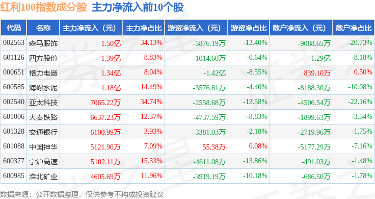 资金流向方面,红利100(399411)指数成份股当日主力资金净流入合计2.39亿元,游资资金净流出合计3.74亿元,散户资金净流入合计1.35亿元。成份股资金流向详情见下表:
