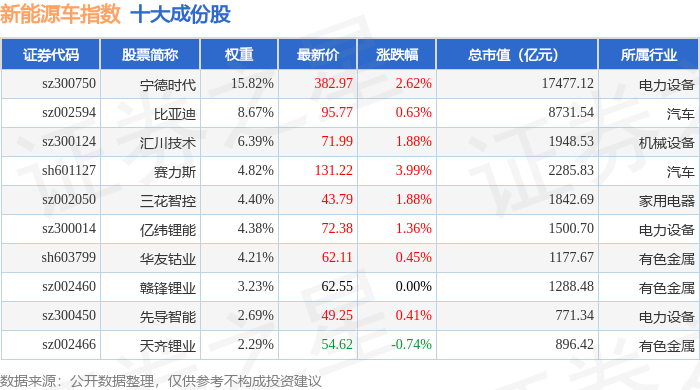证券之星消息,12月1日,新能源车(399417)指数报收于3805.14点,涨1.21%,成交920.91亿元,换手率2.88%。当日该指数成份股中,上涨的有32家,天华新能以6.01%的涨幅领涨,下跌的有16家,湖南裕能以6.09%的跌幅领跌。