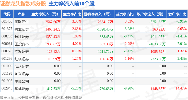资金流向方面,证券龙头(399437)指数成份股当日主力资金净流出合计16.57亿元,游资资金净流出合计883.75万元,散户资金净流入合计16.66亿元。成份股资金流向详情见下表: