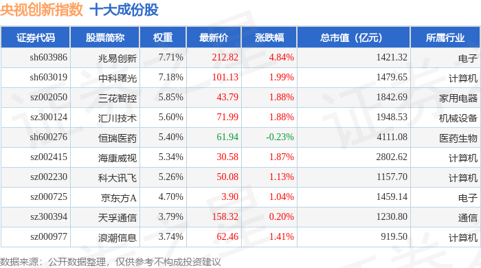 证券之星消息,12月1日,央视创新(399551)指数报收于9915.81点,涨1.51%,成交601.78亿元,换手率1.66%。当日该指数成份股中,上涨的有38家,中天科技以6.25%的涨幅领涨,下跌的有8家,三环集团以2.55%的跌幅领跌。