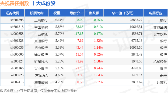 央视责任(399555)指数十大成份股详情如下: