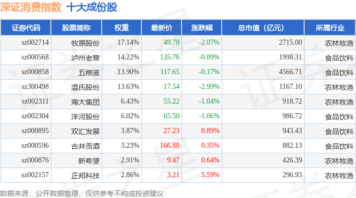 证券之星消息,12月1日,深证消费(399617)指数报收于9735.12点,跌0.67%,成交99.85亿元,换手率1.36%。当日该指数成份股中,上涨的有10家,正邦科技以5.59%的涨幅领涨,下跌的有10家,温氏股份以2.99%的跌幅领跌。