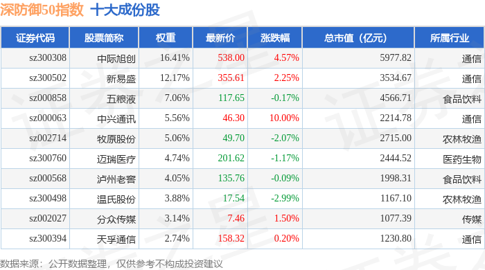 证券之星消息,12月1日,深防御50(399671)指数报收于9751.08点,涨1.51%,成交865.24亿元,换手率2.38%。当日该指数成份股中,上涨的有32家,中兴通讯以10.0%的涨幅领涨,下跌的有18家,蓝色光标以4.1%的跌幅领跌。