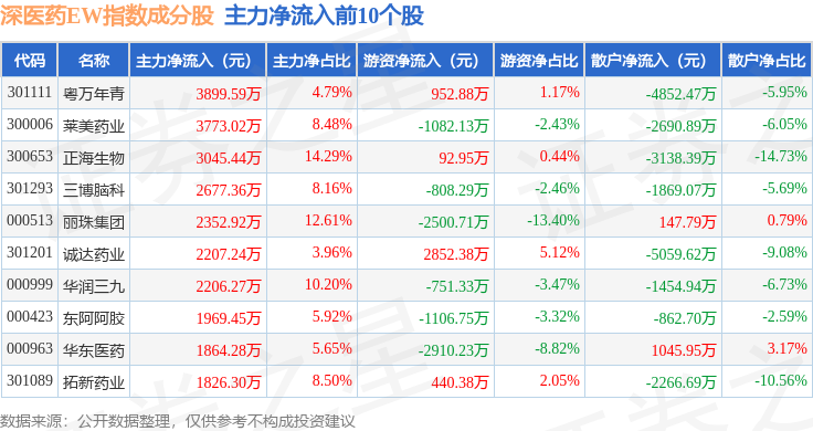 资金流向方面,深医药EW(399676)指数成份股当日主力资金净流出合计10.87亿元,游资资金净流入合计5.78亿元,散户资金净流入合计5.09亿元。成份股资金流向详情见下表: