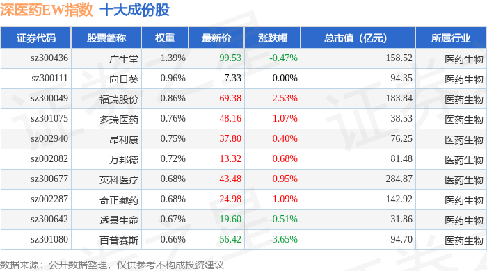证券之星消息,12月1日,深医药EW(399676)指数报收于3892.9点,涨0.45%,成交434.58亿元,换手率1.96%。当日该指数成份股中,上涨的有145家,粤万年青以9.94%的涨幅领涨,下跌的有65家,科源制药以4.51%的跌幅领跌。
