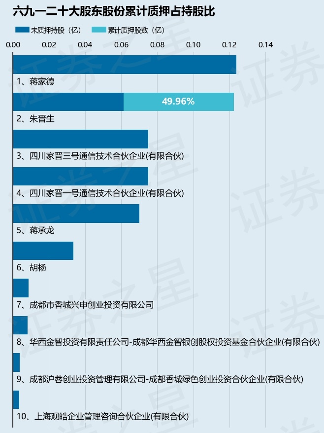 截止本公告日,股东朱晋生已累计质押股份612.0万股,占其持股总数的49.96%。本次质押后六九一二十大股东的累计质押股份占持股比例(占持股比例的计算以公司最新一期财务报表公布的十大股东的持股总数为基准)见下图: