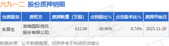 证券之星消息,六九一二(301592)12月1日公开信息显示,股东朱晋生向渤海国际信托股份有限公司合计质押612.0万股,占总股本8.74%。质押详情见下表: