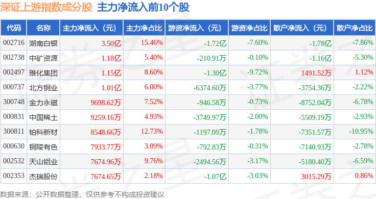 资金流向方面,深证上游(399704)指数成份股当日主力资金净流入合计4.72亿元,游资资金净流出合计6.08亿元,散户资金净流入合计1.36亿元。成份股资金流向详情见下表: