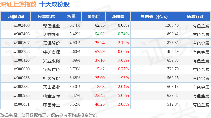 证券之星消息,12月1日,深证上游(399704)指数报收于6236.22点,涨1.95%,成交550.99亿元,换手率3.0%。当日该指数成份股中,上涨的有36家,杰瑞股份以9.99%的涨幅领涨,下跌的有11家,盛新锂能以3.86%的跌幅领跌。
