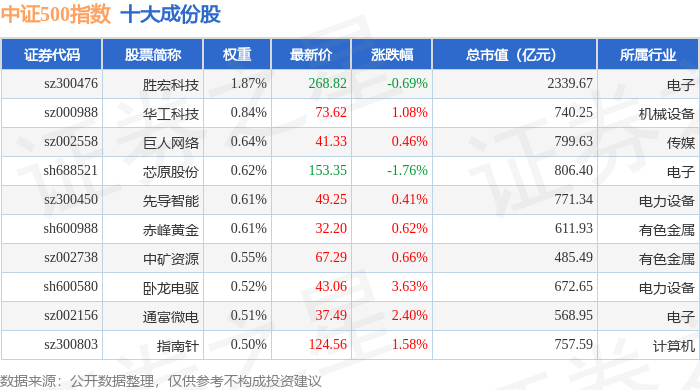 中证500(399905)指数十大成份股详情如下: