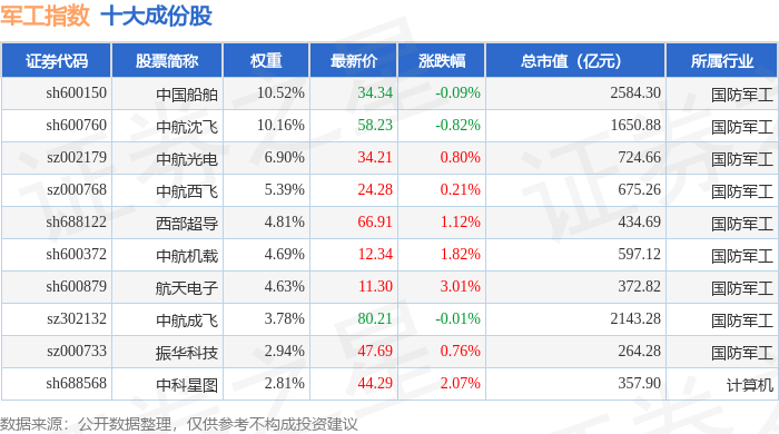 军工指数(399959)十大成份股详情如下: