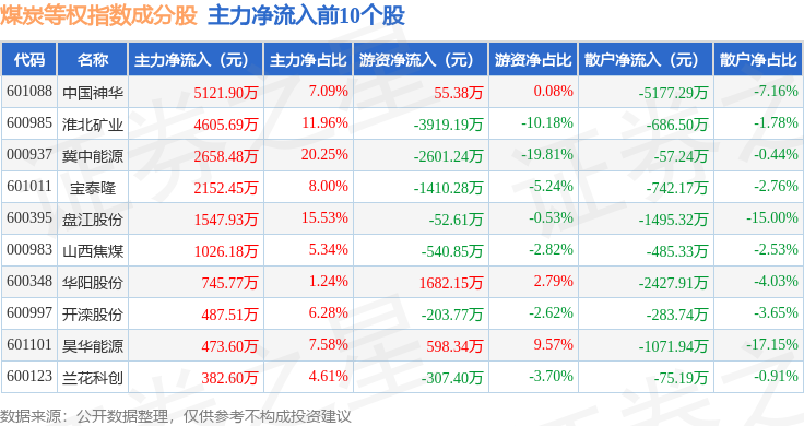 资金流向方面,煤炭等权(399990)指数成份股当日主力资金净流入合计5203.82万元,游资资金净流入合计5989.76万元,散户资金净流出合计1.12亿元。成份股资金流向详情见下表: