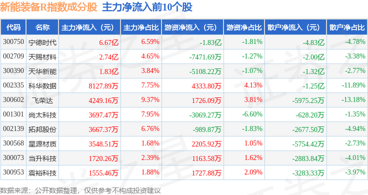 资金流向方面,新能装备R(470043)指数成份股当日主力资金净流出合计16.0亿元,游资资金净流入合计12.64亿元,散户资金净流入合计3.36亿元。成份股资金流向详情见下表: