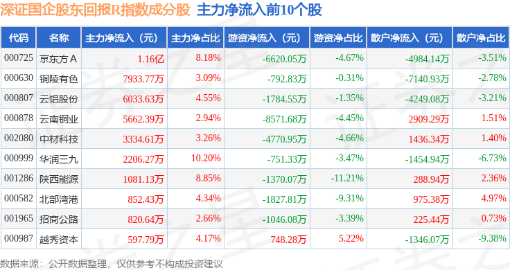资金流向方面,深证国企股东回报R(470064)指数成份股当日主力资金净流出合计1.87亿元,游资资金净流出合计2.14亿元,散户资金净流入合计4.01亿元。成份股资金流向详情见下表: