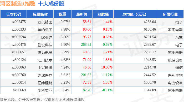 湾区制造R(480009)指数十大成份股详情如下: