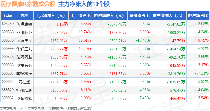 资金流向方面,医疗健康R(480016)指数成份股当日主力资金净流出合计2.61亿元,游资资金净流出合计1104.1万元,散户资金净流入合计2.72亿元。成份股资金流向详情见下表: