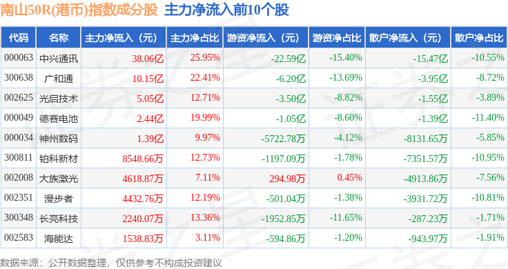 资金流向方面,南山50R(港币)(480024)指数成份股当日主力资金净流入合计54.35亿元,游资资金净流出合计34.1亿元,散户资金净流出合计20.26亿元。成份股资金流向详情见下表: