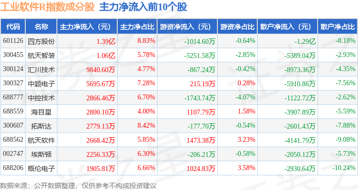 资金流向方面,工业软件R(480034)指数成份股当日主力资金净流入合计6328.53万元,游资资金净流入合计1.24亿元,散户资金净流出合计1.87亿元。成份股资金流向详情见下表: