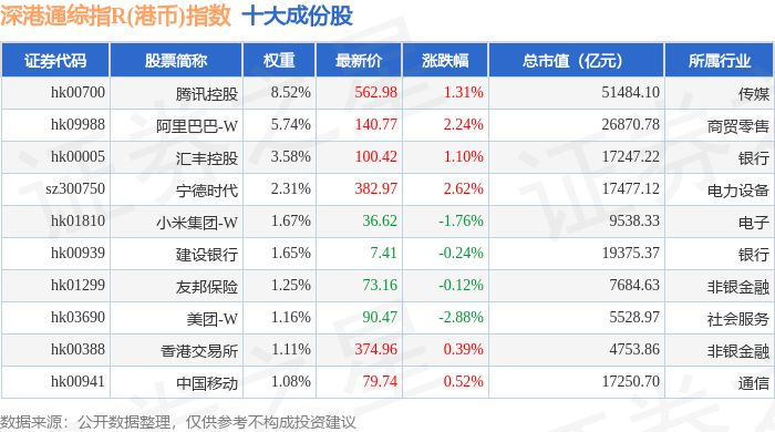 深港通综指R(港币)(483006)指数十大成份股详情如下: