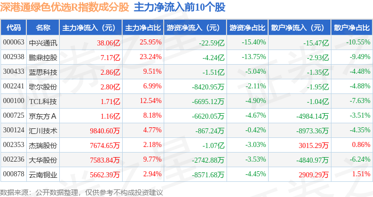 资金流向方面,深港通绿色优选R(483011)指数成份股当日主力资金净流入合计50.76亿元,游资资金净流出合计33.71亿元,散户资金净流出合计17.05亿元。成份股资金流向详情见下表: