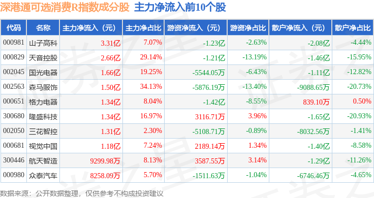 资金流向方面,深港通可选消费R(483019)指数成份股当日主力资金净流出合计8.59亿元,游资资金净流出合计7.57亿元,散户资金净流入合计16.16亿元。成份股资金流向详情见下表: