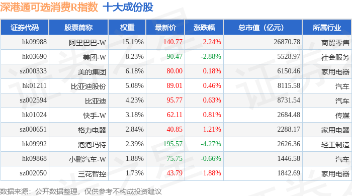 深港通可选消费R(483019)指数十大成份股详情如下: