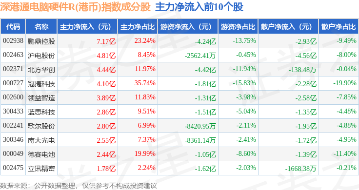 资金流向方面,深港通电脑硬件R(港币)(483044)指数成份股当日主力资金净流入合计25.89亿元,游资资金净流出合计9.88亿元,散户资金净流出合计16.01亿元。成份股资金流向详情见下表:
