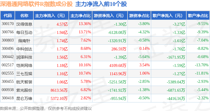 资金流向方面,深港通网络软件R(483047)指数成份股当日主力资金净流入合计9966.19万元,游资资金净流入合计5129.66万元,散户资金净流出合计1.51亿元。成份股资金流向详情见下表: