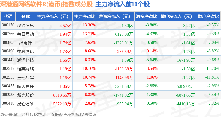 资金流向方面,深港通网络软件R(港币)(483048)指数成份股当日主力资金净流入合计9966.19万元,游资资金净流入合计5129.66万元,散户资金净流出合计1.51亿元。成份股资金流向详情见下表: