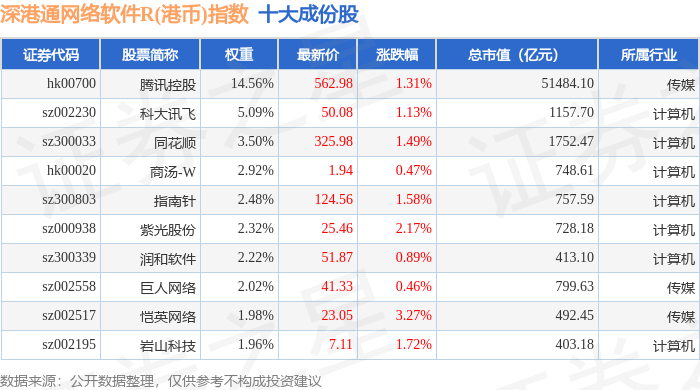 深港通网络软件R(港币)(483048)指数十大成份股详情如下: