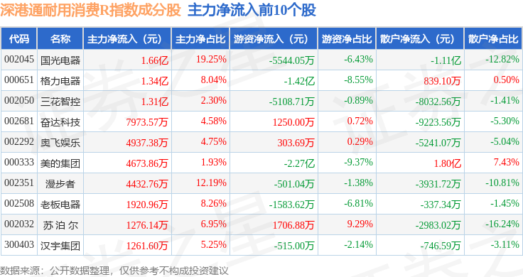 资金流向方面,深港通耐用消费R(483049)指数成份股当日主力资金净流入合计4.23亿元,游资资金净流出合计5.41亿元,散户资金净流入合计1.18亿元。成份股资金流向详情见下表: