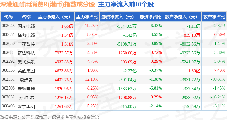 资金流向方面,深港通耐用消费R(港币)(483050)指数成份股当日主力资金净流入合计4.23亿元,游资资金净流出合计5.41亿元,散户资金净流入合计1.18亿元。成份股资金流向详情见下表: