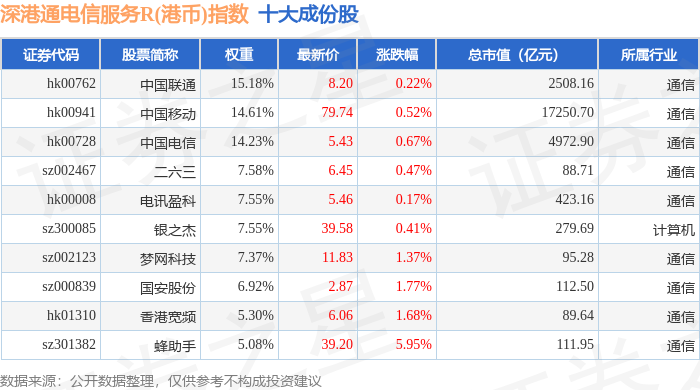深港通电信服务R(港币)(483058)指数十大成份股详情如下: