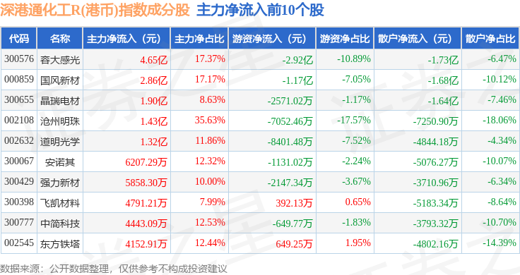 资金流向方面,深港通化工R(港币)(483064)指数成份股当日主力资金净流入合计5.03亿元,游资资金净流出合计5.06亿元,散户资金净流入合计357.54万元。成份股资金流向详情见下表: