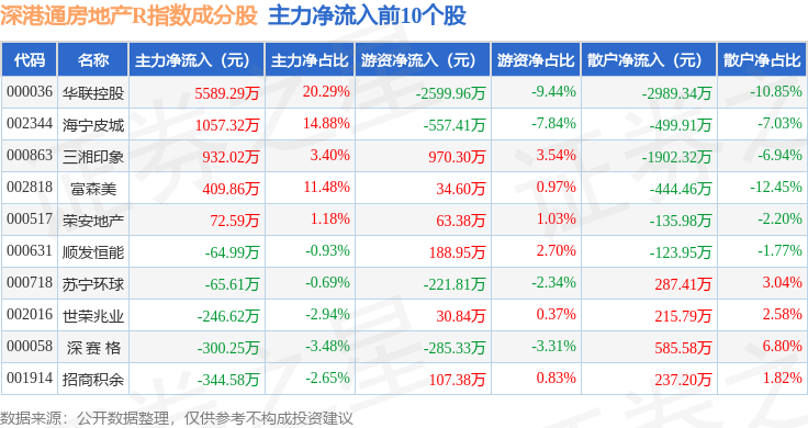 资金流向方面,深港通房地产R(483071)指数成份股当日主力资金净流出合计7.89亿元,游资资金净流入合计6446.27万元,散户资金净流入合计7.25亿元。成份股资金流向详情见下表: