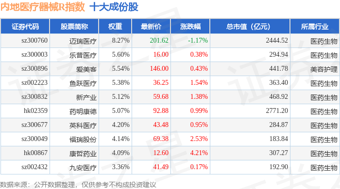 内地医疗器械R(483103)指数十大成份股详情如下:
