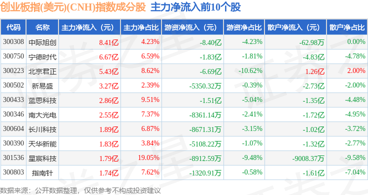 资金流向方面,创业板指(美元)(CNH)(970007)指数成份股当日主力资金净流出合计13.76亿元,游资资金净流出合计9894.97万元,散户资金净流入合计14.75亿元。成份股资金流向详情见下表: