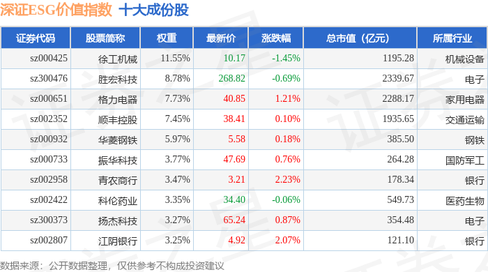 深证ESG价值(970061)指数十大成份股详情如下: