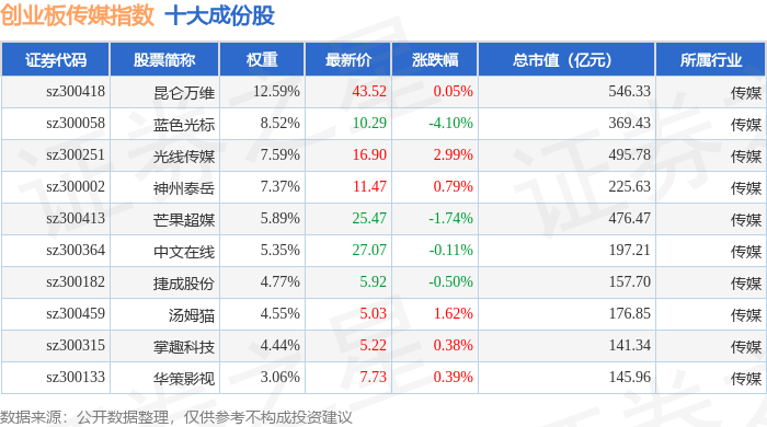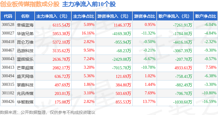 资金流向方面,创业板传媒(970084)指数成份股当日主力资金净流出合计16.11亿元,游资资金净流入合计4593.75万元,散户资金净流入合计15.65亿元。成份股资金流向详情见下表:
