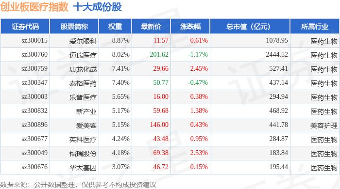 证券之星消息,12月1日,创业板医疗(970082)指数报收于3712.07点,涨0.49%,成交86.52亿元,换手率1.16%。当日该指数成份股中,上涨的有35家,九强生物以4.43%的涨幅领涨,下跌的有15家,诚达药业以4.26%的跌幅领跌。