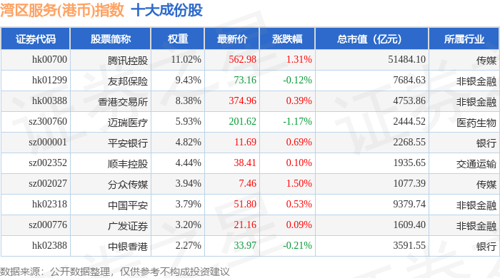 湾区服务(港币)(980012)指数十大成份股详情如下: