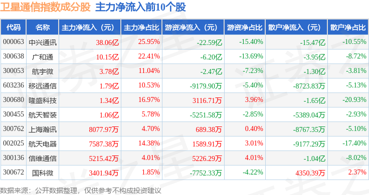 资金流向方面,卫星通信(980018)指数成份股当日主力资金净流入合计36.59亿元,游资资金净流出合计28.06亿元,散户资金净流出合计8.53亿元。成份股资金流向详情见下表: