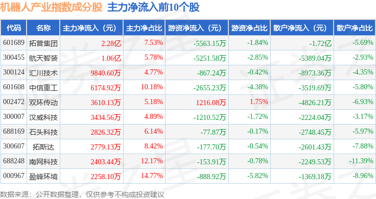 资金流向方面,机器人产业(980022)指数成份股当日主力资金净流入合计5.86亿元,游资资金净流出合计2.33亿元,散户资金净流出合计3.31亿元。成份股资金流向详情见下表: