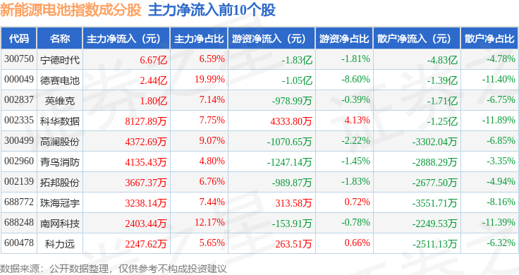 资金流向方面,新能源电池(980027)指数成份股当日主力资金净流出合计7.76亿元,游资资金净流入合计7.5亿元,散户资金净流入合计2589.16万元。成份股资金流向详情见下表: