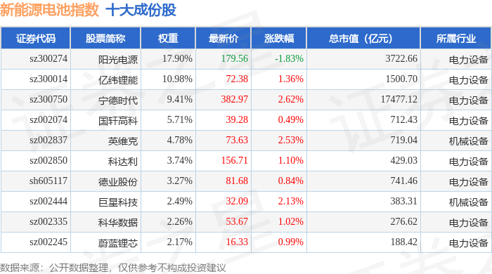 证券之星消息,12月1日,新能源电池(980027)指数报收于3337.09点,涨0.51%,成交471.59亿元,换手率2.02%。当日该指数成份股中,上涨的有35家,德赛电池以10.0%的涨幅领涨,下跌的有15家,金盘科技以2.48%的跌幅领跌。